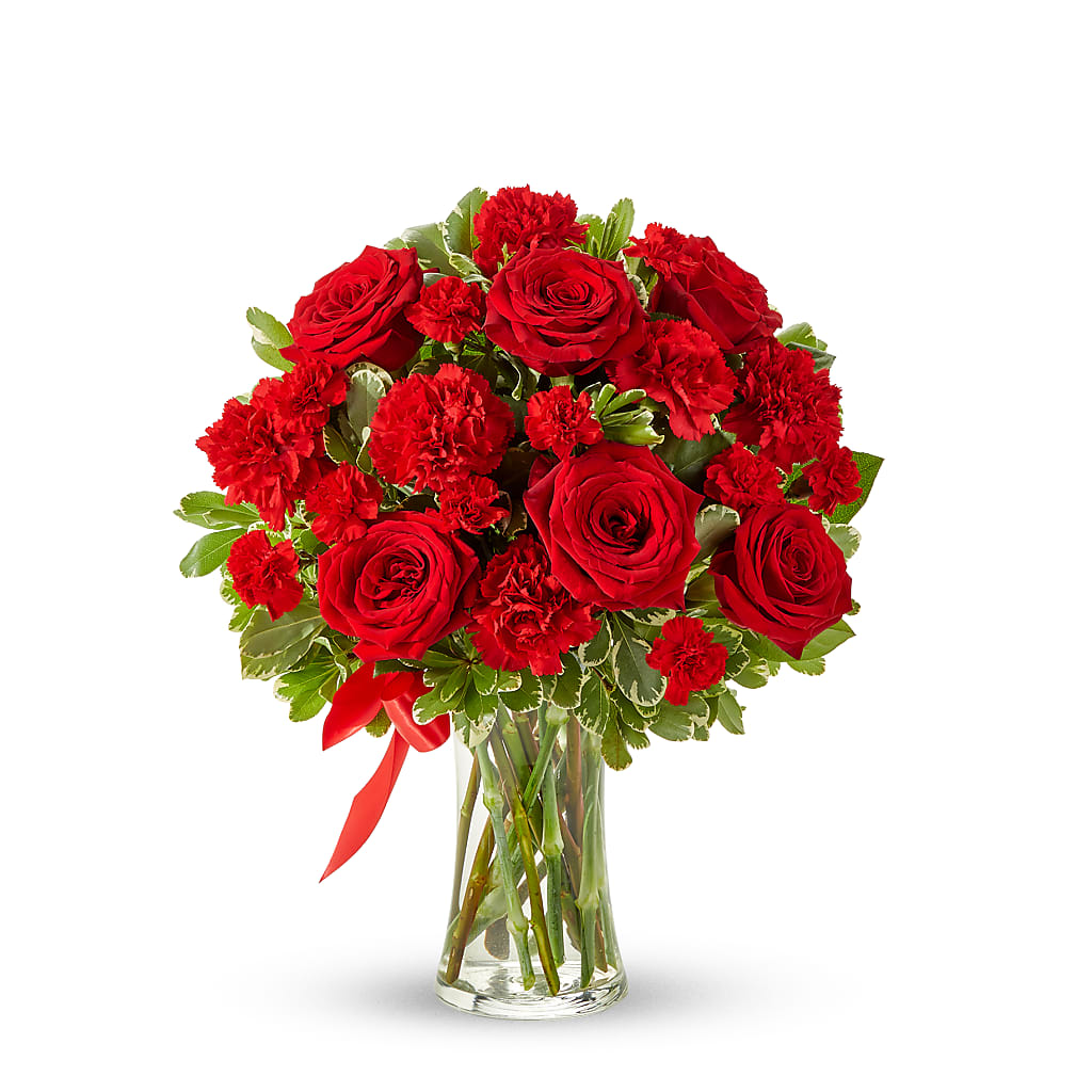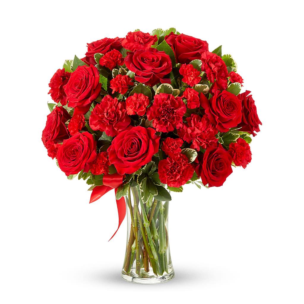 Let your love bloom with this beautiful, lush bouquet. This all red flower arrangement is hand-arranged by a local florist near you with classic red roses, along with red carnations. All the red flowers make this gift a wonderful way of letting someone in your life know they are important to you and you appreciate all the love they give you. The red roses and carnations are delivered in a clear glass vase with a red ribbon tied around the center.